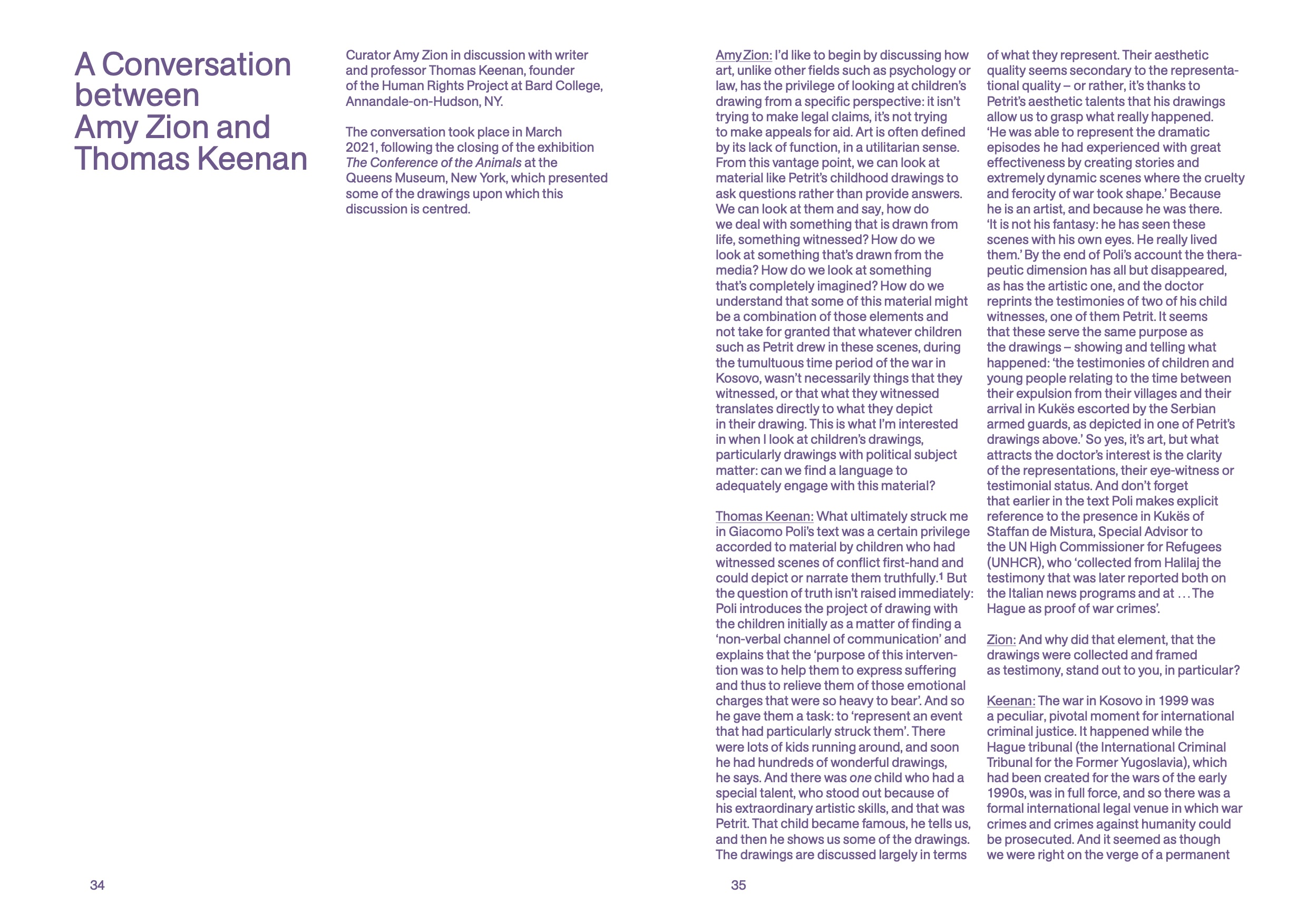 This book was published to coincide with an eponymous exhibition by Petrit Halilaj at Tate St. Ives, curated by Anne Barlow. For the exhibition, Halilaj created a new installation based on drawings he made at age 13, while living in Kükes II, a refugee camp in Albania during the war in Kosovo. Reproductions of the original drawings were included in the exhibition The Conference of the Animals at Queens Museum in New York, an exhibition I curated in collaboration with artist Ulrike Müller. Barlow and Halilaj invited me and my colleague, Thomas Keenan, co-founder of the Human Rights Project at Bard College, to contribute a conversation about the drawings in the context of the war and a broader history of human rights and drawings by children to this publication.
